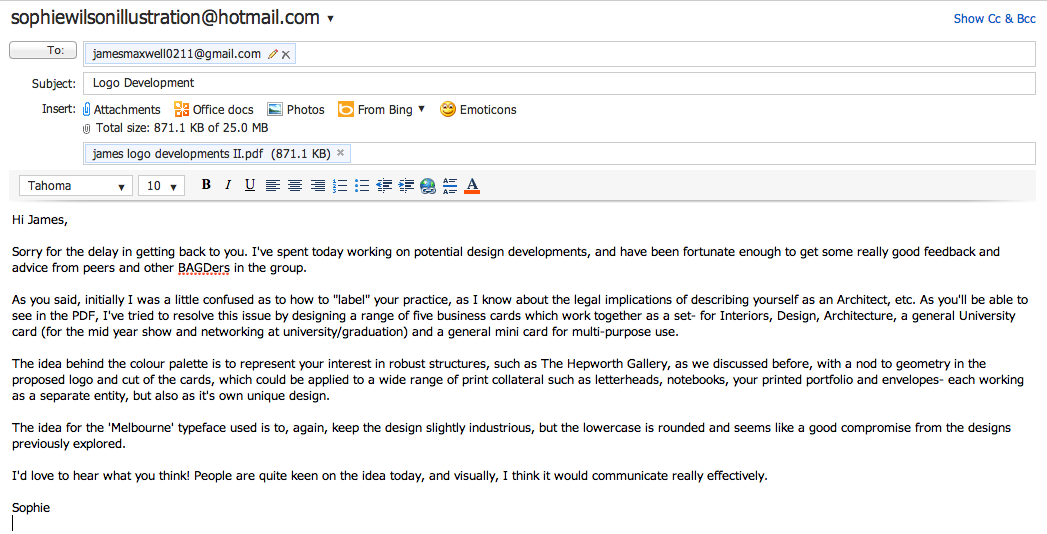The submission sent through to James for feedback from today's design developments- progressing with the brand concept.