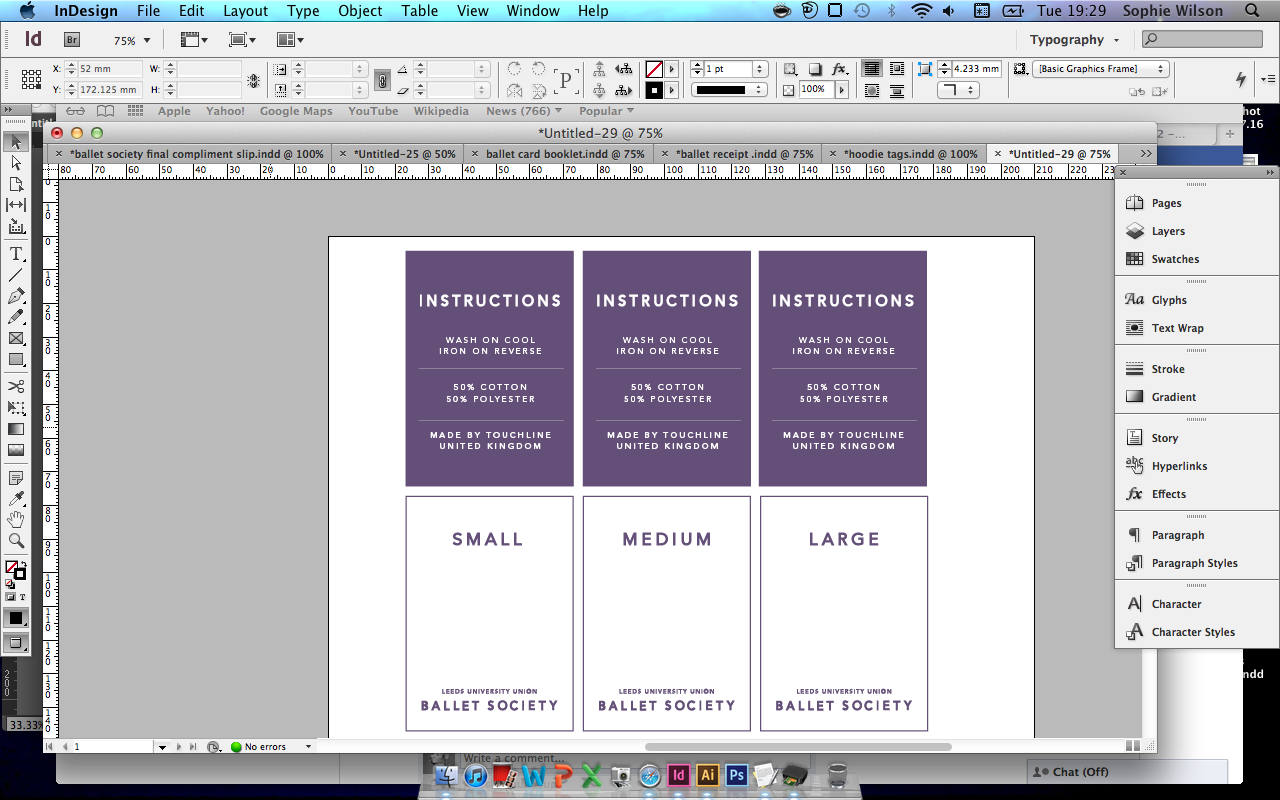 Generally quite happy with the outcomes which look clean, contemporary, but give a nod to tradition and a sense of regality (that ballet is so often associated with) through the purple colour scheme- hoping to get all of the outcomes, including the modelled hoodie, photographed on Friday, ready to go onto the finalised design submission boards and printed for Monday before Wednesday's hand in.